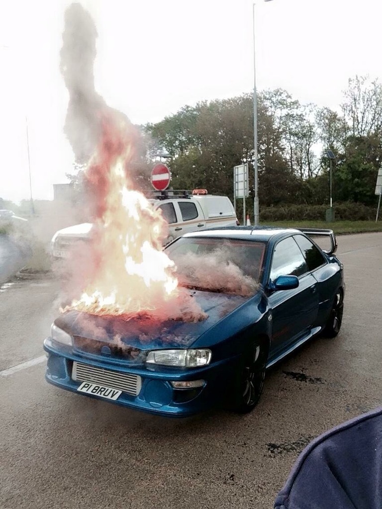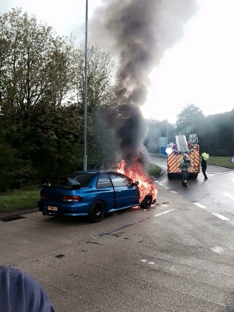 So I go up there see the car started fine they then done the first oil change there and then for me so I then take the car home for the first time to which I get 15 minutes away from scoobybits garage and it bursts into flames (didn't even make it home !) trapping me inside and nearly killing me if it wasn't for a brave bloke yanking me outof the car is be dead right now !!