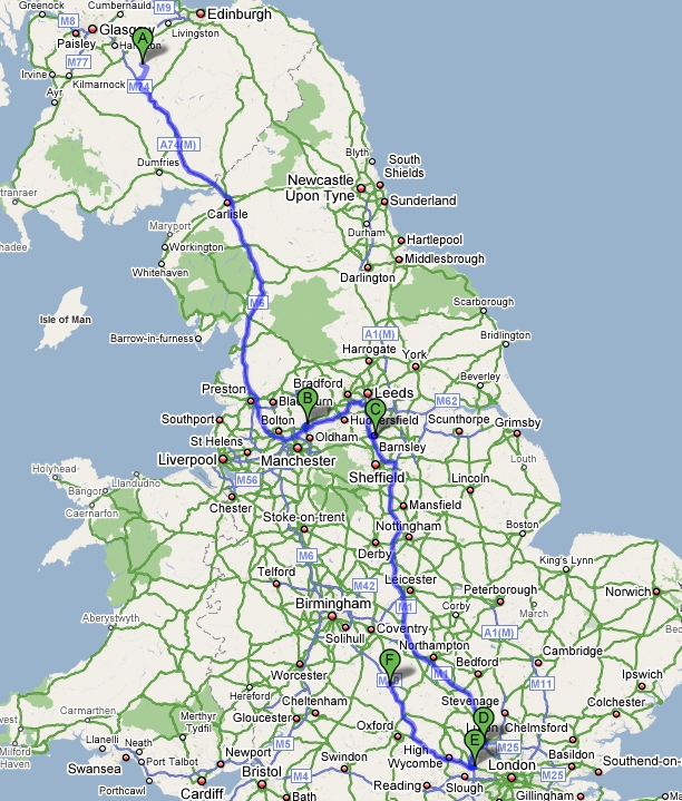 From there it's straight down the M1 to the M25, round the M25 counter-clockwise then up the M40 to Banbury. Ignore the green Google Map pointers. They don't represent stop-off points or anything, they're just waypoints to get the route plotted correctly. Much more will come once the recce has been carried out next month.