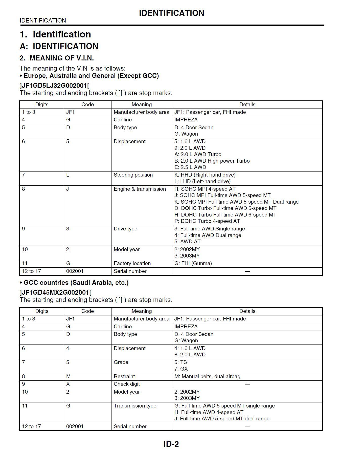 The Meaning of VIN as relating to Subaru Newage models (Europe/Australia/Rest of the World)