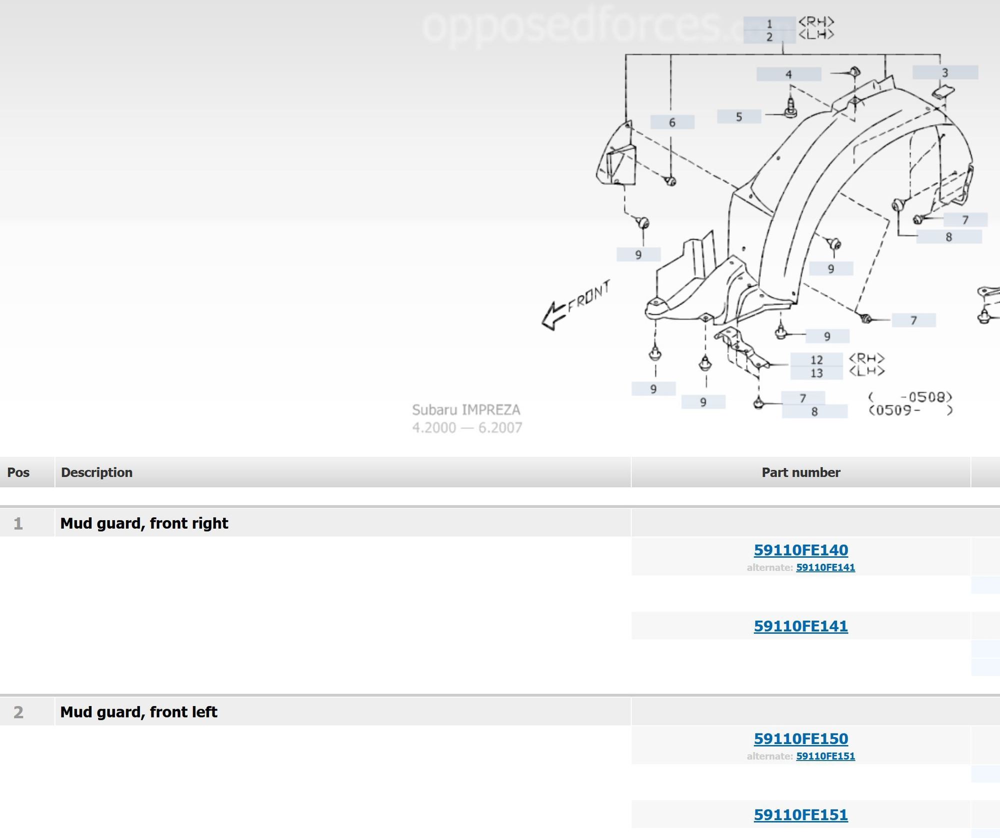 My passanger arch liner has this part number 59110FE150 and I assume the drivers side is 59110fe140 but I can't find these part numbers on opposedforces.com