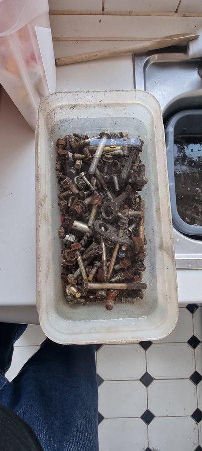 Well let's see how the old vinegar trick works out. Washing up bowl has been left over night and small one was done this morning. Hopefully will clean the bolts up ready for the subaru too come home for the weekend