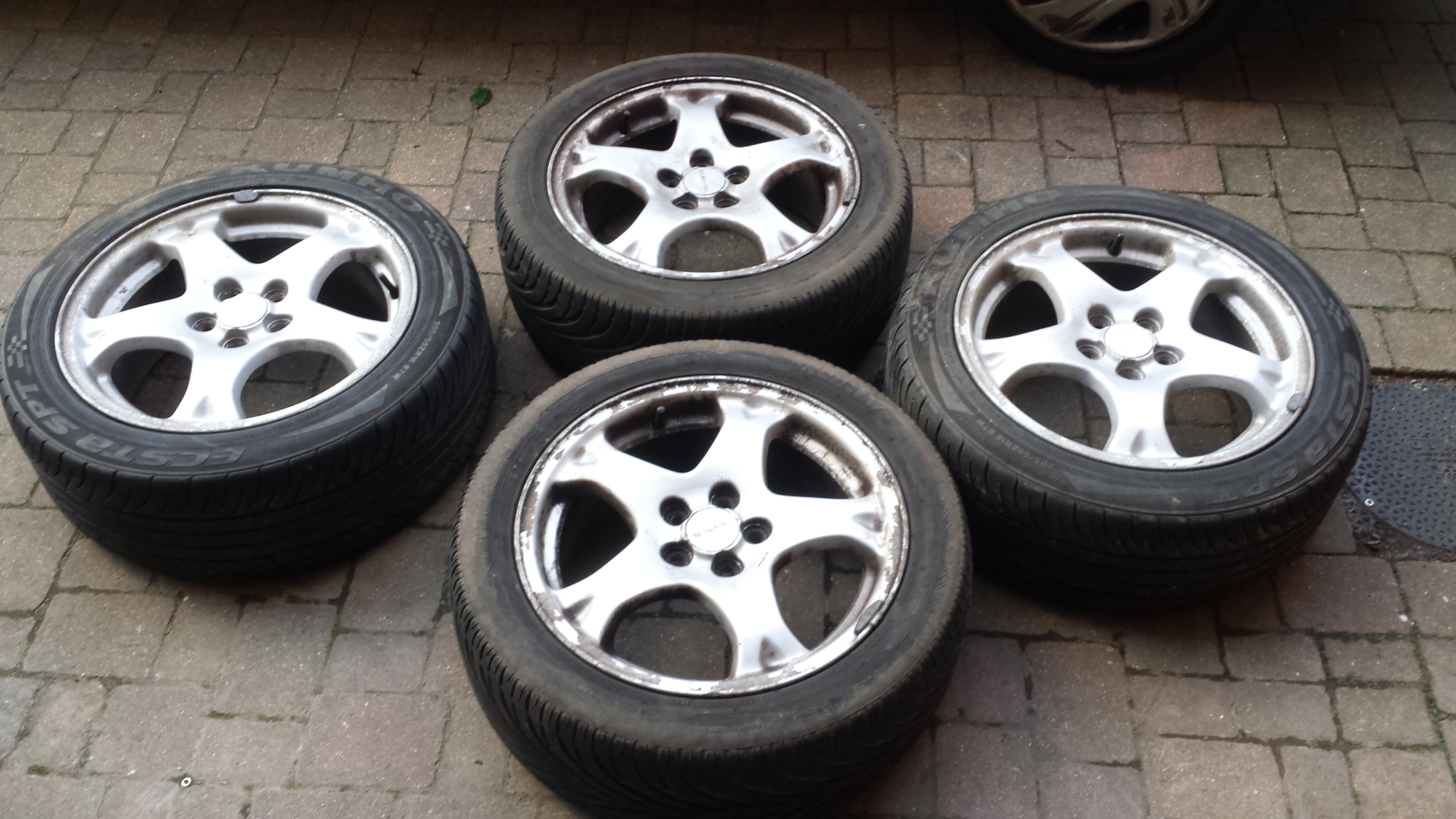 16" silver classic wheels, in desperate need of a refurb and clean. Two tyres are ok but the other two went flat and were left standing for months while my car was off the road.